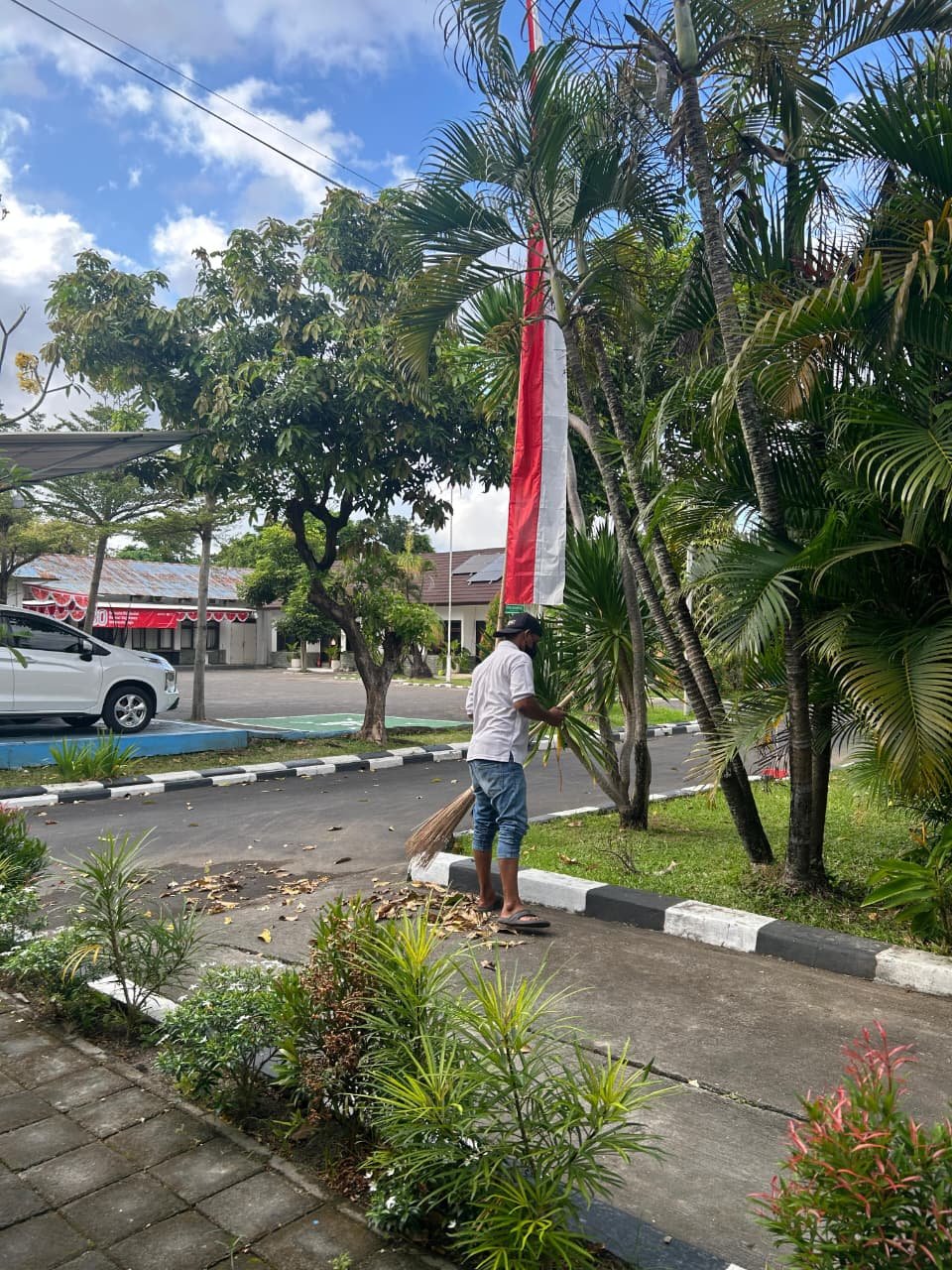 Halaman kantor dibersihkan setiap hari secara teratur agar area luar kantor selalu tampak tertata. Aktivitas ini meliputi penyapuan, pengumpulan sampah, serta perawatan lingkungan sekitar, sehingga baik karyawan maupun tamu yang datang dapat merasakan kenyamanan sejak memasuki area kantor. Di sisi lain, ruangan kerja dan ruangan pendukung juga selalu dibersihkan setiap hari, sehingga aktivitas pekerjaan dapat dilakukan dengan tenang dan terhindar dari gangguan kebersihan.
